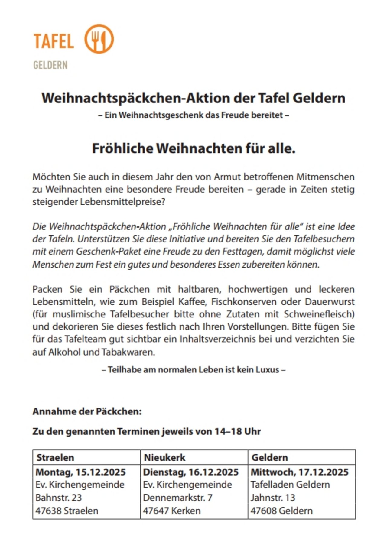 Weihnachtspäckchen-Aktion der Tafel Geldern